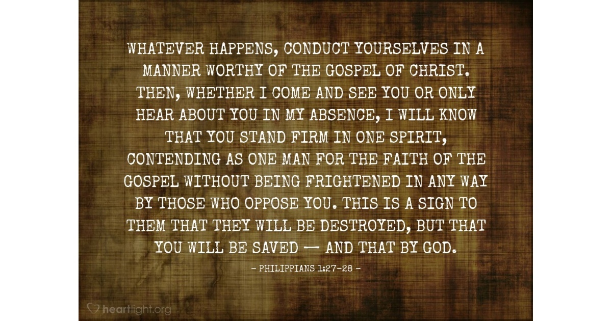 Qualunque cosa accada, comportatevi in modo degno del vangelo di Cristo. Quindi, se vengo a trovarti o sento parlare di te solo in mia assenza, saprò che stai fermo in uno spirito, contendendo come un solo uomo per la fede del vangelo senza essere spaventato in alcun modo da coloro che si oppongono a te. Questo è un segno per loro che saranno distrutti, ma che tu sarai salvato - e questo da Dio.