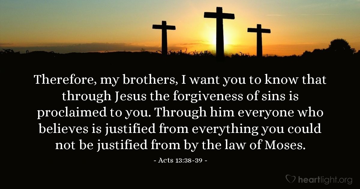 Pertanto, fratelli miei, voglio che sappiate che attraverso Gesù vi viene proclamato il perdono dei peccati. Per mezzo di lui tutti coloro che credono sono giustificati da tutto ciò che non si poteva essere giustificati dalla legge di Mosè. —Atti 13:38-39