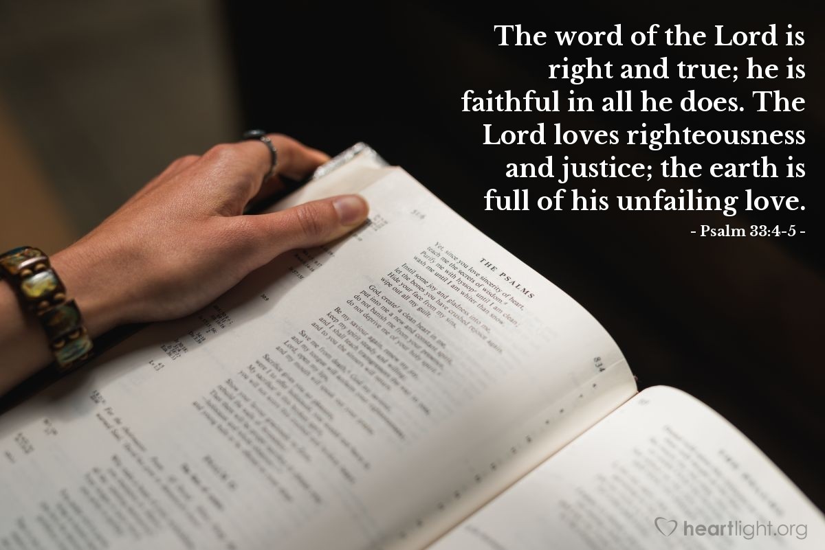 La parola del Signore è giusta e vera; egli è fedele in tutto ciò che fa. Il Signore ama la giustizia e la giustizia; la terra è piena del suo amore infallibile. —Salmo 33:4-5