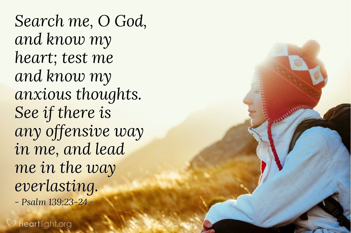 Cercami, o Dio, e conosci il mio cuore; mettimi alla prova e conosci i miei pensieri ansiosi. Vedi se c'è qualche modo offensivo in me e guidami nella via eterna. —Salmo 139:23-24