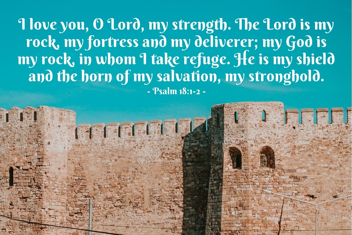 Ti amo, o Signore, la mia forza. Il Signore è la mia roccia, la mia fortezza e il mio liberatore; il mio Dio è la mia roccia, nel quale mi rifugio. Lui è il mio scudo e il corno della mia salvezza, la mia roccaforte. —Salmo 18:1-2