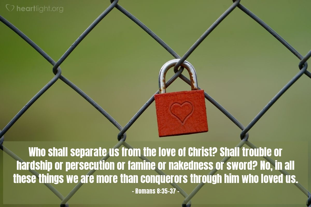 Who shall separate us from the love of Christ? Shall trouble or hardship or persecution or famine or nakedness or sword? ... No, in all these things we are more than conquerors through him who loved us. —Romans 8:35-37