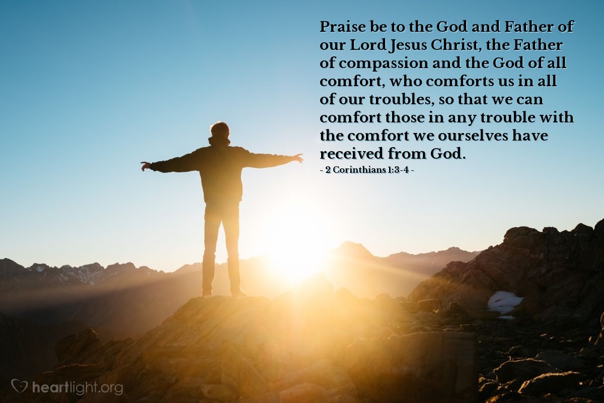 Sia lodato il Dio e il Padre del Signore nostro Gesù Cristo, il Padre della compassione e il Dio di ogni conforto, che ci conforta in tutti i nostri problemi, in modo che possiamo confortare coloro che sono in ogni difficoltà con il conforto che noi stessi abbiamo ricevuto da Dio.