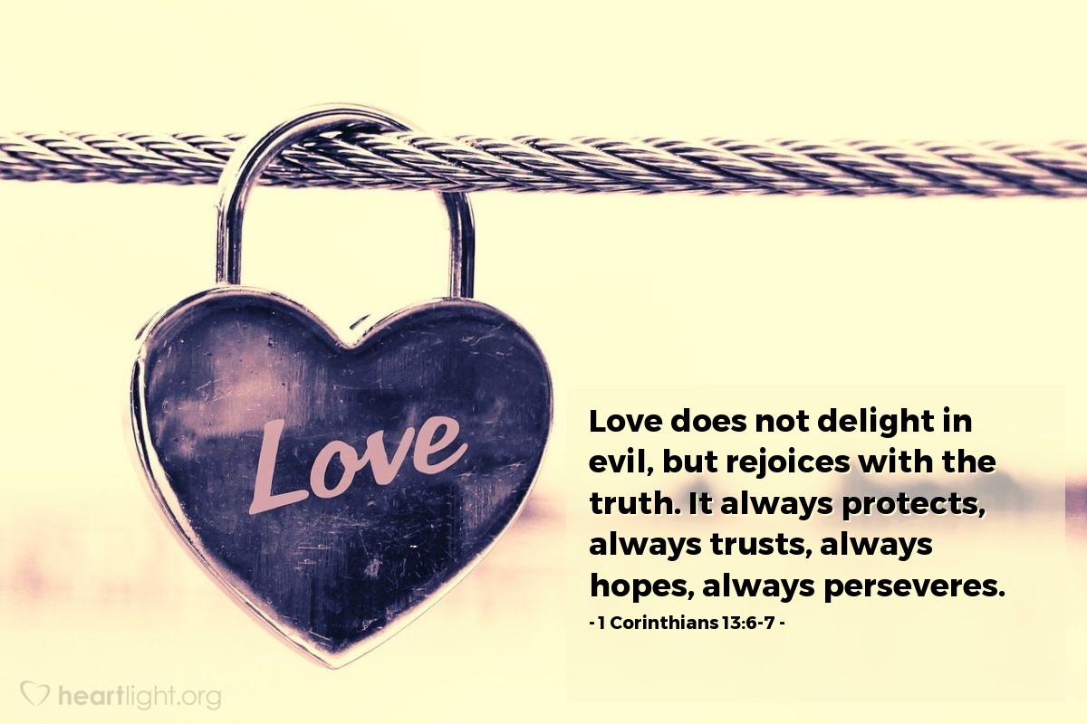 L'amore non si diletta nel male, ma si rallegra della verità. Protegge sempre, si fida sempre, spera sempre, persevera sempre. —1 Corinzi 13:6-7