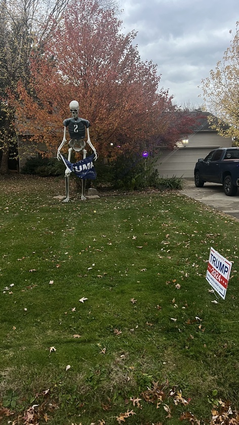 Earlier on my walk...one of my fave Halloween decorations #Trump2024 (the skeleton's sign got a bit wind blown though it was very windy today & tonight too)