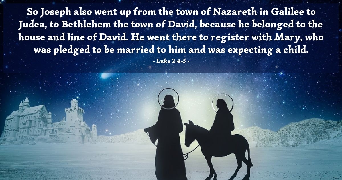Così Giuseppe salite anche dalla città di Nazareth in Galilea alla Giudea, a Betlemme, la città di Davide, perché apparteneva alla casa e alla linea di Davide. Andò lì per registrarsi con Mary, che si era impegnata a sposarlo e aspettava un figlio.