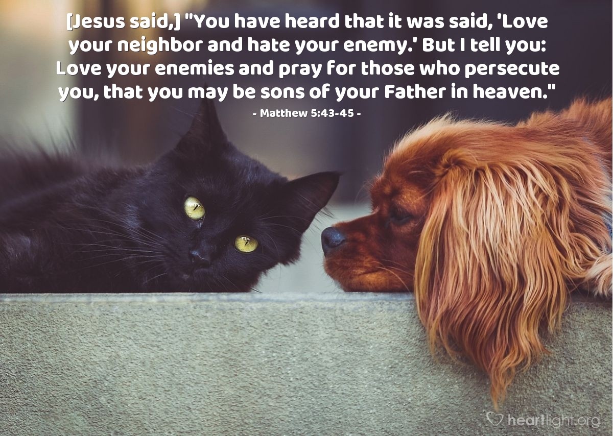 "Hai sentito che è stato detto: 'Ama il tuo prossimo e odia il tuo nemico'. Ma io vi dico: amate i vostri nemici e pregate per coloro che vi perseguitano, perché siate figli del Padre vostro in cielo". —Matteo 5:43-45