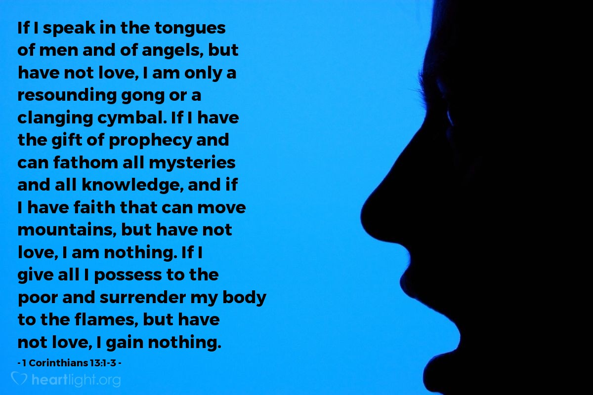 Se parlo nelle lingue degli uomini e degli angeli, ma non ho amore, sono solo un gong clamoroso o un piatto tintinnante. Se ho il dono della profezia e posso sondare tutti i misteri e tutte le conoscenze, e se ho una fede che può spostare le montagne, ma non ha amore, non sono nulla. Se do tutto ciò che possiedo ai poveri e consegno il mio corpo alle fiamme, ma non ho amore, non guadagno nulla.