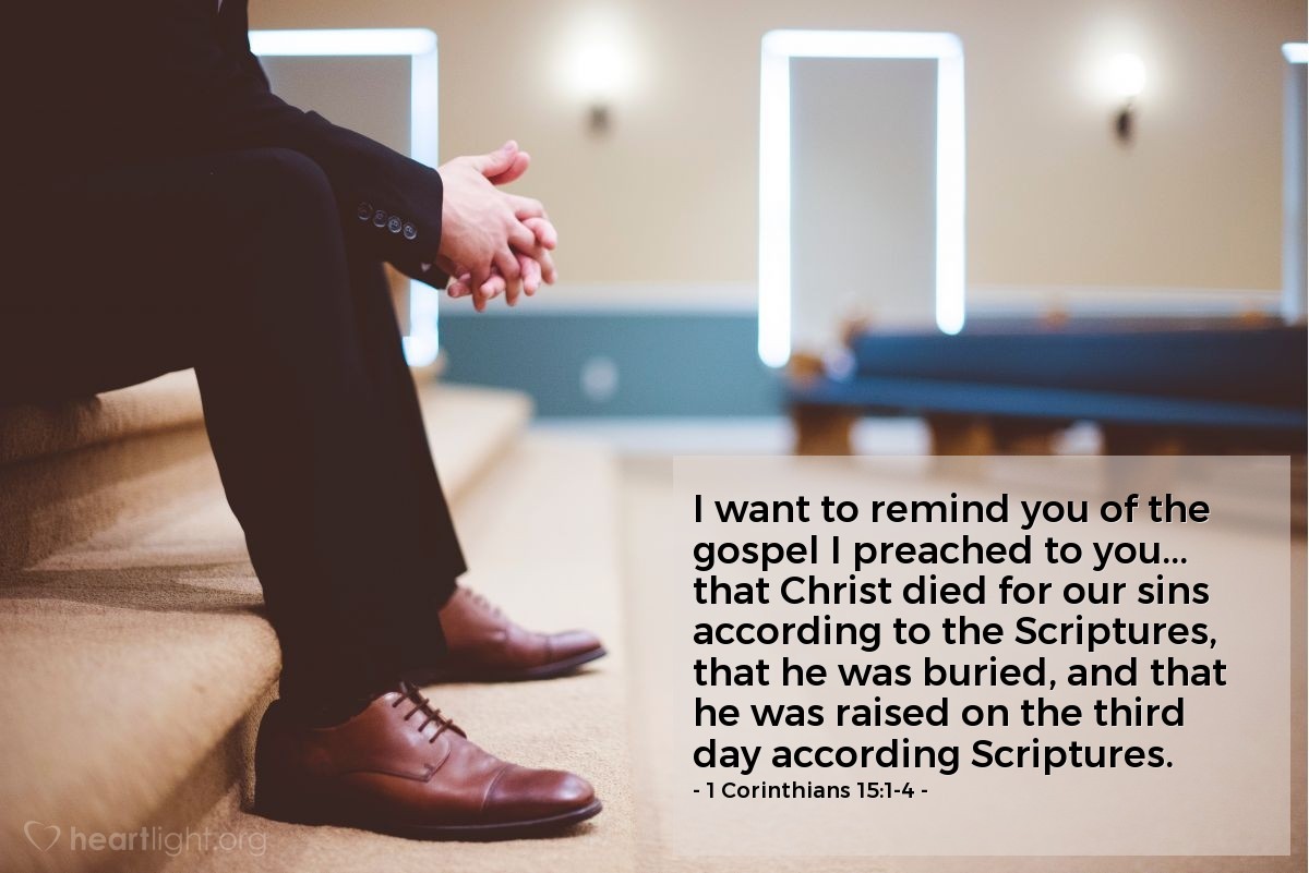 Voglio ricordarvi il vangelo che vi ho predicato... che Cristo morì per i nostri peccati secondo le Scritture, che fu sepolto e che risuscitò il terzo giorno secondo le Scritture. —1 Corinzi 15:1-4