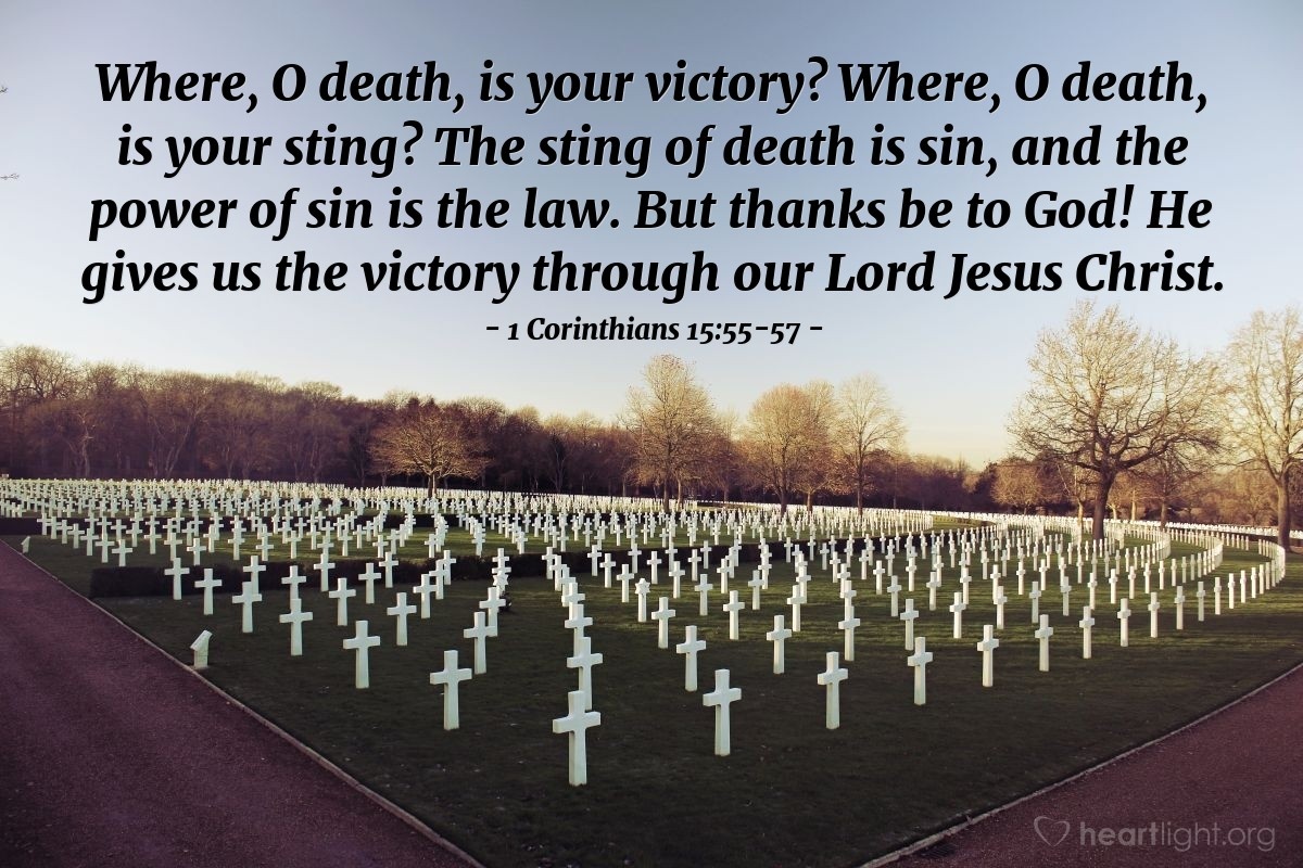 Dov'è, o morte, la tua vittoria? Dov'è, o morte, la tua puntura? Il pungiglione della morte è il peccato, e il potere del peccato è la legge. Ma grazie a Dio! Egli ci dà la vittoria per mezzo del nostro Signore Gesù Cristo. —1 Corinzi 15:55-57